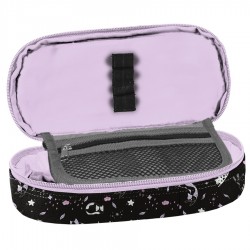 - Wewnątrz klapka z gumkami do ołówków i długopisów z jednej strony oraz z kieszonką na zamek z siatki z drugiej.