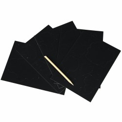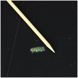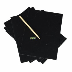 W opakowaniu znajduje się 5 szablonów z konturami do wydrapywania, obrazki kryjące się za wydrapywanką są w formie naklejek, rylec bambusowy do wydrapywania.