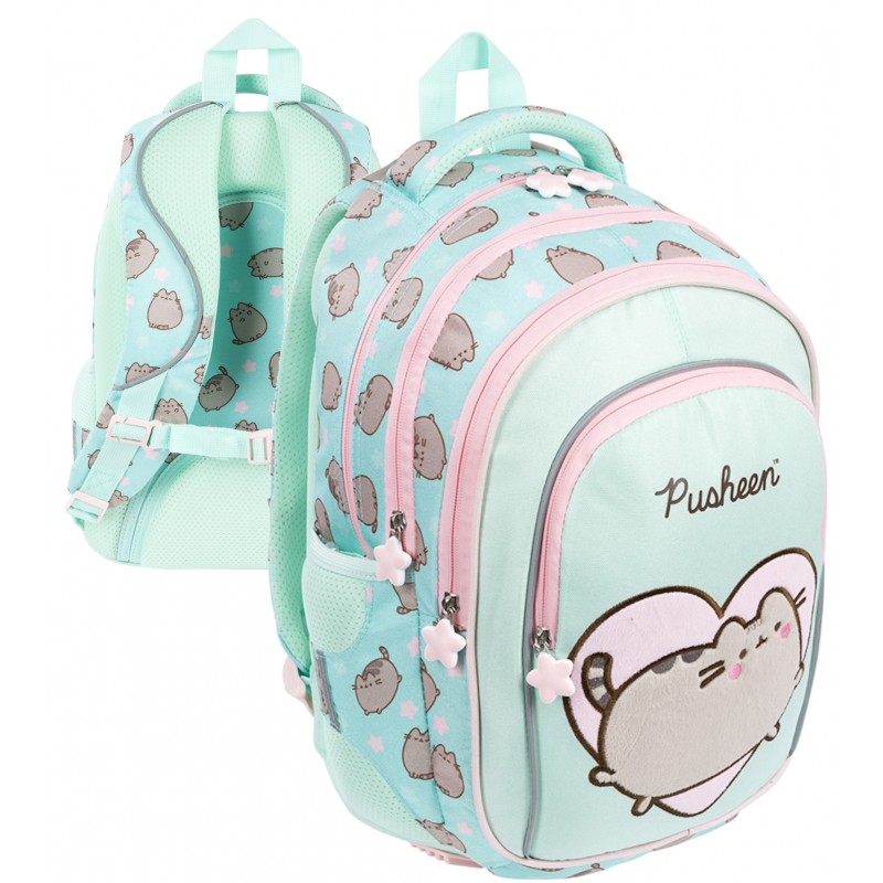 Plecak utrzymany jest w pastelowym, miętowym kolorze z motywem sympatycznej kotki Pusheen, co z pewnością przypadnie do gustu młodym uczennicom. Gumowe zawieszki przy suwakach dodają uroku i ułatwiają korzystanie z zamków błyskawicznych.