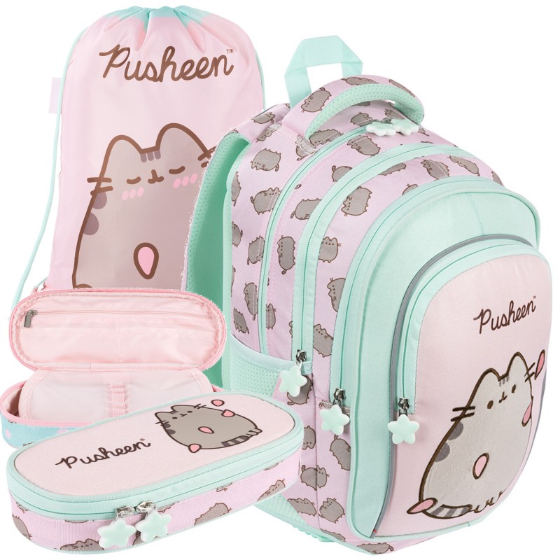 Plecak utrzymany jest w pastelowym, miętowym kolorze z motywem sympatycznej kotki Pusheen, co z pewnością przypadnie do gustu młodym uczennicom. Gumowe zawieszki przy suwakach dodają uroku i ułatwiają korzystanie z zamków błyskawicznych.