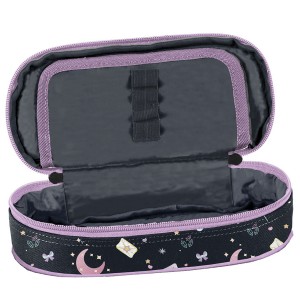 - Wewnątrz klapka z gumkami do ołówków i długopisów z jednej strony oraz z kieszonką na zamek z siatki z drugiej.
