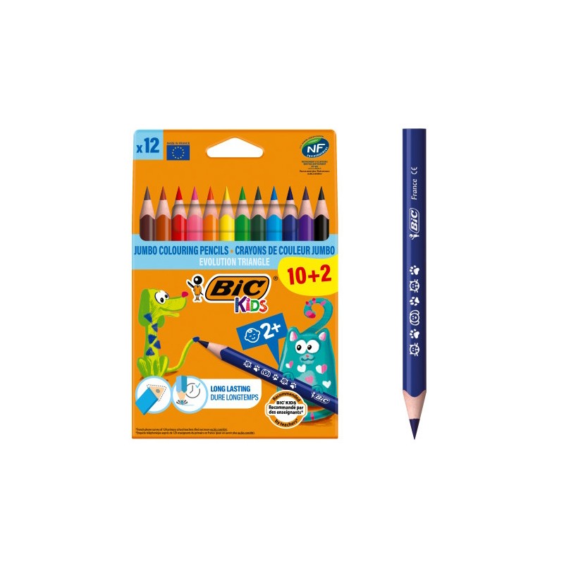 Dostępne w komplecie 12 żywych kolorów kredki do kolorowania BIC Kids Evolution Triangle zostały opracowane z myślą o ultratrwałości i są zalecane dla dzieci od 2. roku życia.
