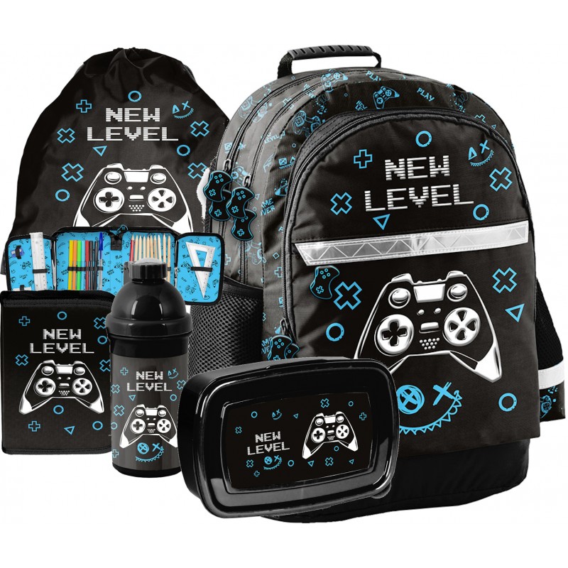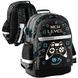 Plecak szkolny New Level to idealny wybór dla miłośników gier i nowoczesnego stylu. Ma dynamiczny design inspirowany światem gamingowym – na jego przedniej części znajduje się duży nadruk pada do gier oraz stylowa nazwa New Level w futurystycznej czcionce.