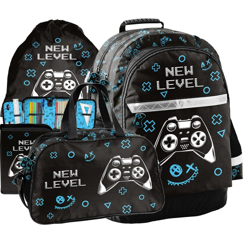 Plecak szkolny New Level to idealny wybór dla miłośników gier i nowoczesnego stylu. Ma dynamiczny design inspirowany światem gamingowym – na jego przedniej części znajduje się duży nadruk pada do gier oraz stylowa nazwa New Level w futurystycznej czcionce.