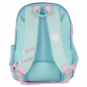 - Na zewnątrz znajduje się bardzo obszerna przednia, zapinana kieszeń, po bokach dwie kieszenie ze ściągaczem idealne na umieszczenie w nich bidonu z napojem oraz mała kieszonka na zamek z przodu. Plecy i szelki wyściełane gąbką zapewniają komfort użytkowania i równomierne rozłożenie obciążenia na plecach dziecka.