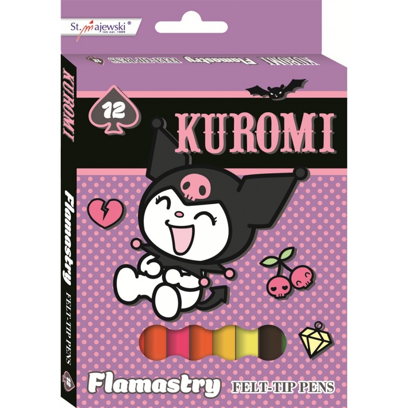 Flamastry Kuromi to zestaw 12 intensywnych, trwałych kolorów zamkniętych w poręcznych pisakach z motywem zadziornej bohaterki Kuromi. Idealne do rysowania, kolorowania i kreatywnych zabaw w domu, szkole czy przedszkolu. Każdy flamaster posiada wentylowaną skuwkę i wygodny uchwyt dopasowany do dziecięcej dłoni. Żywe kolory, które dobrze kryją i nie przebijają przez papier, sprawiają, że zestaw świetnie sprawdzi się zarówno w codziennym użytkowaniu, jak i w artystycznych projektach. Całość prezentuje się wyjątkowo stylowo – idealna dla małych fanów stylu kawaii!