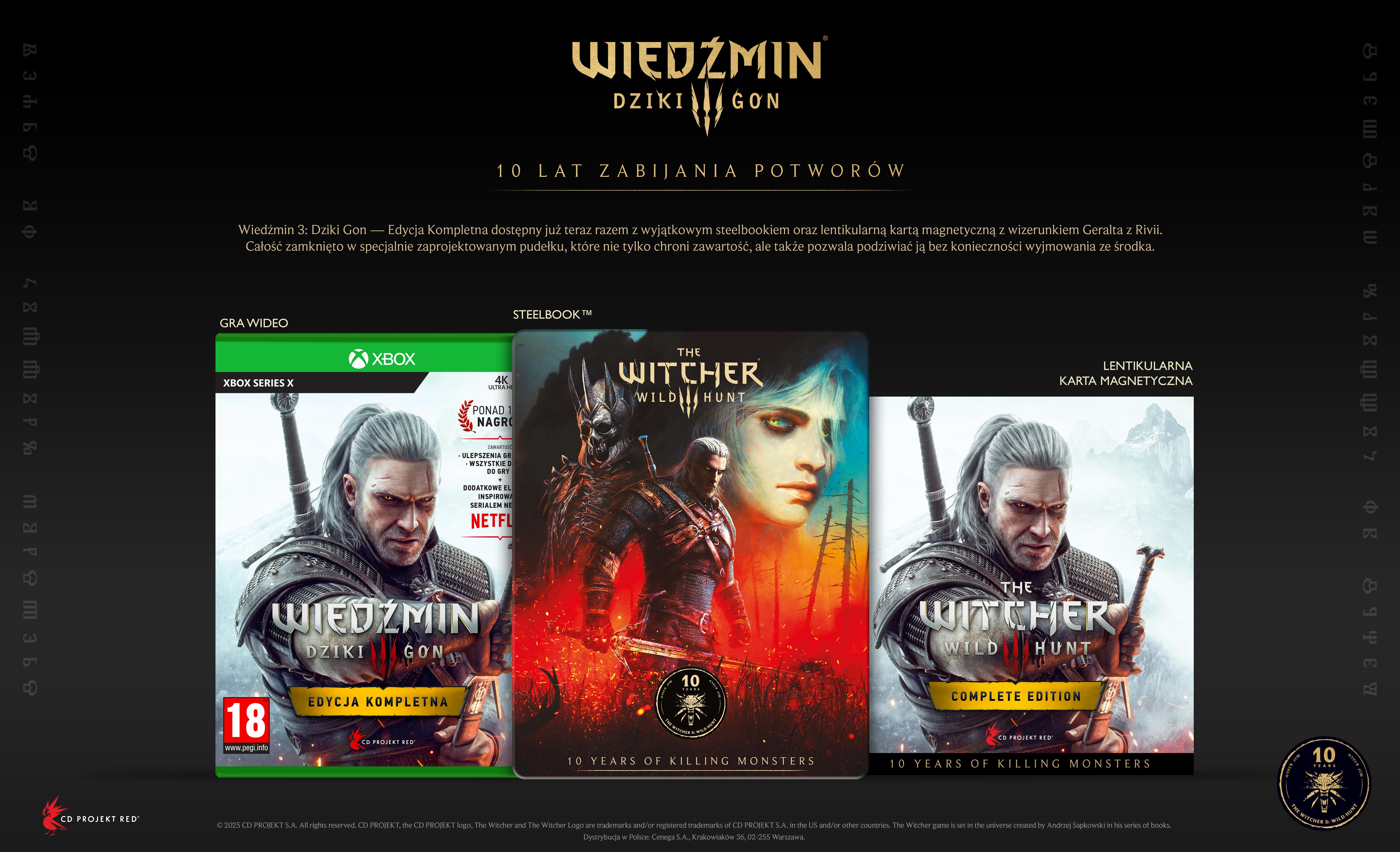 Edycja na 10-lecie gry Wiedźmin 3 Dziki Gon zawiera pełną wersję gry w Edycji Kompletnej (PlayStation 5, Xbox Series X) lub Edycji Gry Roku (PC), lentikularną kartę magnetyczną oraz wyjątkowy, jubileuszowy steelbook.
