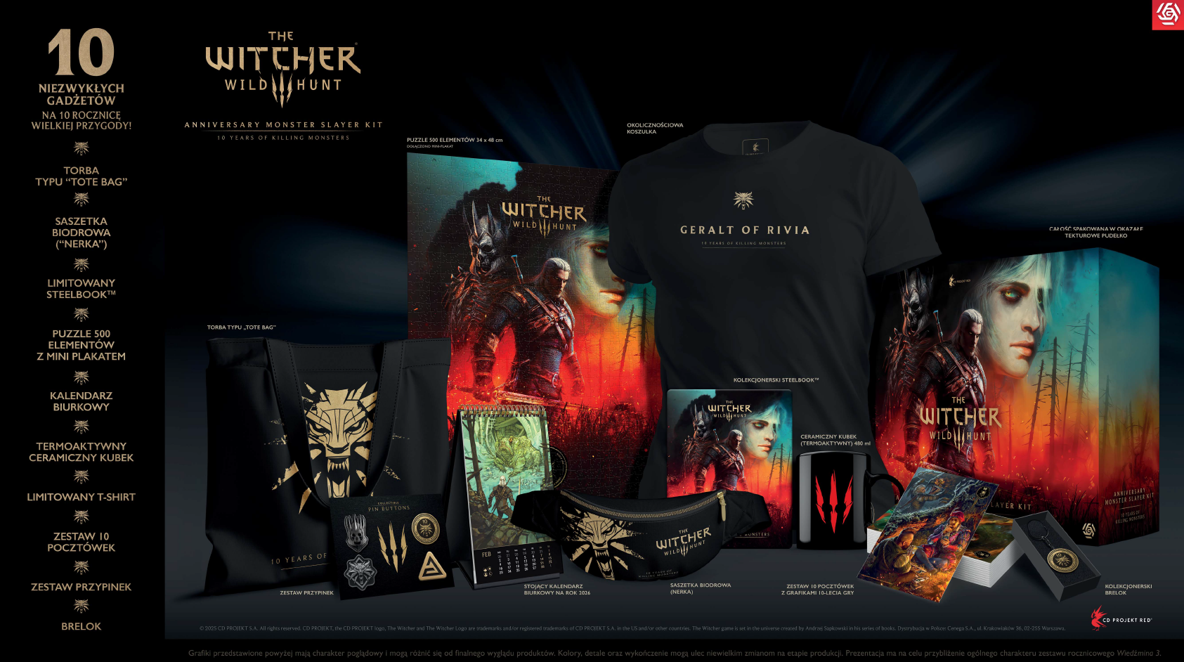 Wyrusz ponownie na szlak z wyjątkowym Zestawem Pogromcy Potworów, stworzonym z okazji dziesiątej rocznicy premiery gry Wiedźmin 3: Dziki Gon. W środku czeka 10 unikalnych niespodzianek przygotowanych z myślą o graczach znających świat Geralta – od kultowych gadżetów i kolekcjonerskich grafik, po praktyczne wyposażenie godne prawdziwych łowców potworów. Zarzuć na siebie nerkę Szkoły Wilka, napij się ulubionego trunku z kubka Dzikiego Gonu, ułóż oszałamiające puzzle, a stalowy medalion noś zawsze przy sobie na breloku do kluczy. Każdy element to hołd dla podróży, bitew i legend, które dzieliliśmy przez te dziesięć niezapomnianych lat.